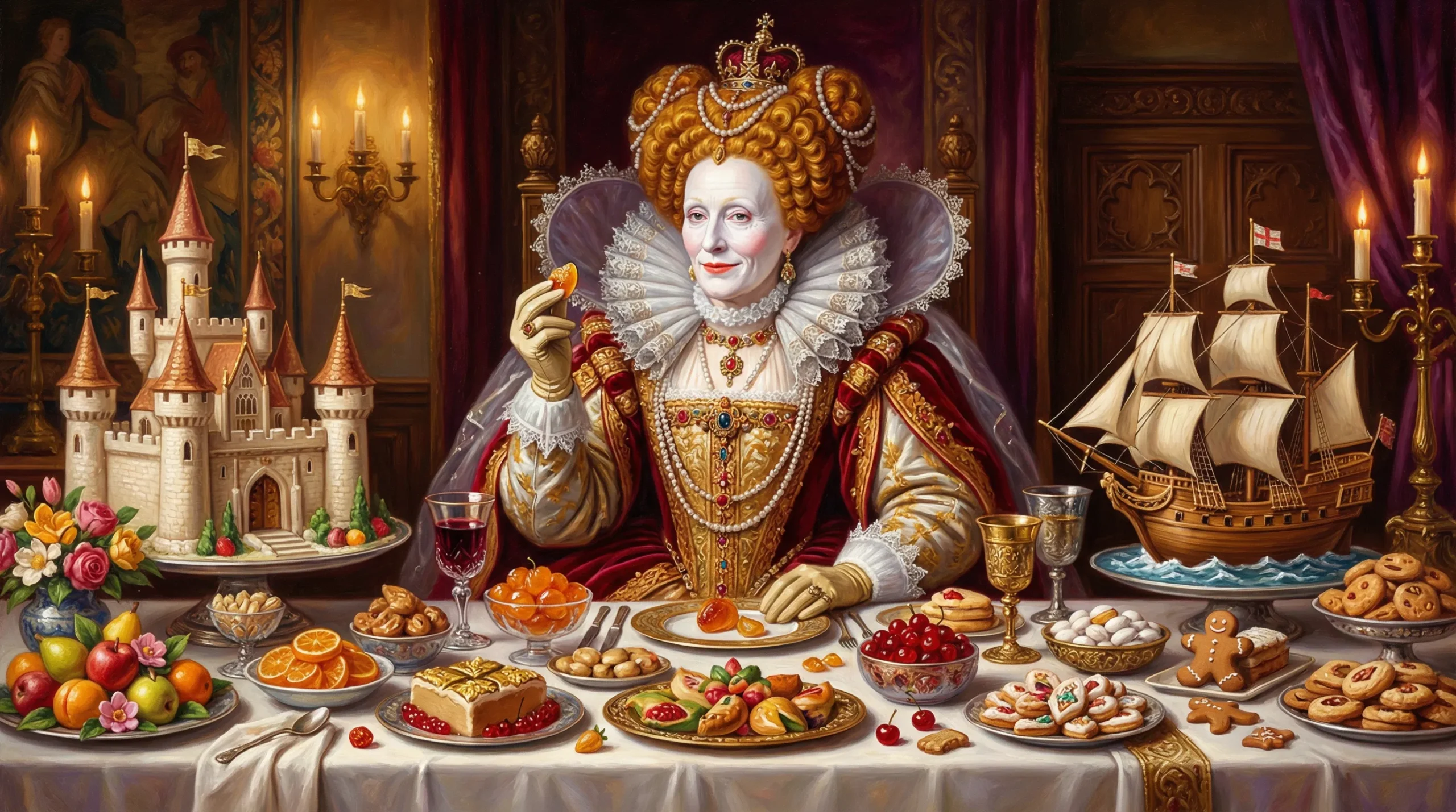 アン・ブーリンが「砂糖文化の萌芽」を宮廷にもたらしたとすれば、エリザベスはそれを国家的な象徴にまで高めた。砂糖菓子は、外国の使節を驚嘆させ、イングランドの富と文化的洗練を誇示する手段となった。エリザベスは、シラバブ(甘いワインまたはサイダーにミルクと砂糖を混ぜて泡立てたもの)やアーモンドペーストを特に好んだとされる。